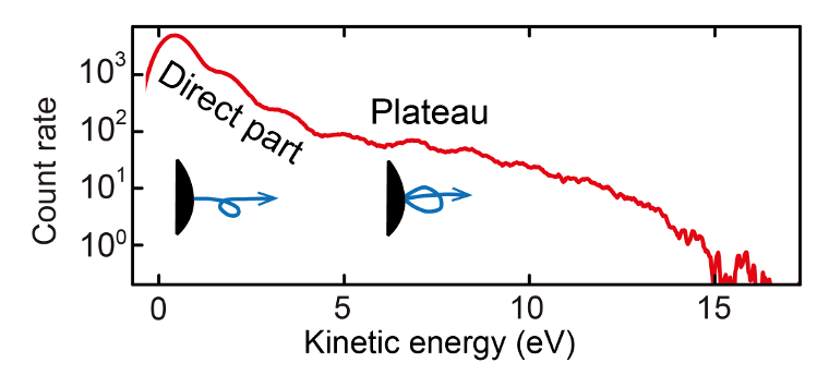 As already touched upon in the last paragraph, we have evidence that electrons are influenced by the light field so strongly that they return to the tip’s surface within about 2/3 of an optical cycle after emission and recollide with it. This mechanism is foundational for attosecond science which is usually performed with atomic or molecular gases, but now also possible at solid surfaces. Recollision manifests itself (among effects like High-Harmonic Generation) in high-energy photoelectrons that form a plateau structure in the energy spectrum (see Figure). These electrons originate from elastic scattering at the metal surface, the so-called rescattering effect. We were able to understand the relevant physics with a simple semiclassical model lent from atomic physics, the very successful Three-Step Model. A much more realistic model from solid-state physics was applied to our system by the Burgdörfer Group at the TU Vienna: Time-dependent density functional theory (TDDFT), which agrees very well with the data. The models show that we are able to control the electron motion on the attosecond time scale by the waveform of the driving laser field, given by the CEP. The newly observed phenomena might ultimately lead to the realization of lightwave electronics, i.e., electronics with optical driving frequencies (about 100,000 times faster than today’s standards).